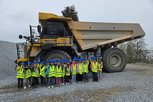 Das absolute Highlight für die Viertklässler war der direkte Kontakt mit der Technik. Am umgangssprachlich genannten „Loch“ (= der Tiefgang) wurde der Abbau des Granits erklärt, und bei den gewaltigen Muldenkippern, die bis zu 63 Tonnen Gestein transportieren, durften die Kinder sogar einmal in das Führerhaus klettern und sich wie echte Profis fühlen.